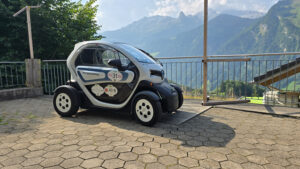 Nun ist mir während der Ladezeit doch noch etwas Überraschendes, etwas sehr Positives passiert. Irgendwann während der Fragerei und dem Fachsimpeln merkte Xaver, dass Diego sehr viel Interesse an einer Testfahrt mit mir hatte. Er hätte schon oft gerne mal einen Twizy getestet, um mal einen direkten Vergleich zu haben. Also gab Xaver ihm den Schlüssel. Nun wurde ich kurz im Dorf Meilen rumgekurvt. Xaver hat natürlich vergessen, ein Erinnerungsfoto davon zu machen.